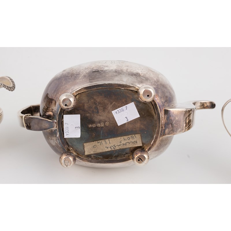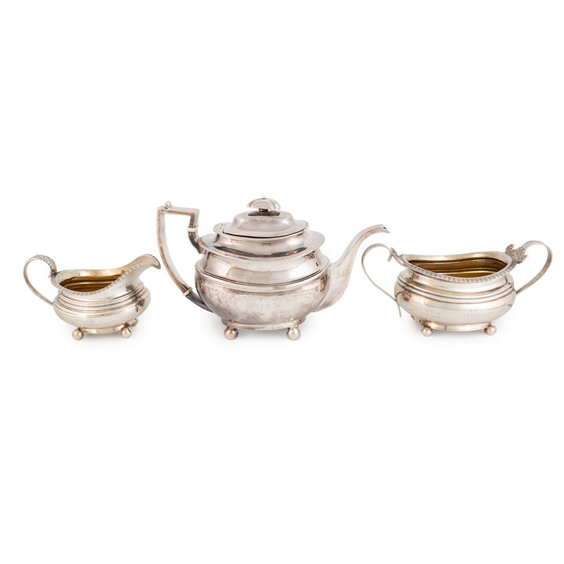 the sugar bowl by Darling & Bell, Newcastle 1821, the cream jug by James Bell, Newcastle 1819, bellied oblong forms, scroll handles, the teapot with ivory insulators, on four ball feet, length handle to spout 26.5cm, total approx. weight 29.7oz. (3)