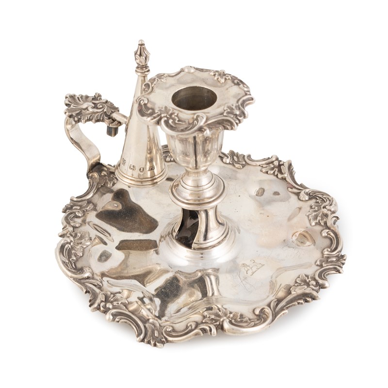 shaped circular form with a scroll foliate borders, urn-shaped capital, pull-off drip pan and conical snuffer, engraved with a crest, diameter 17cm, approx. weight 13oz.