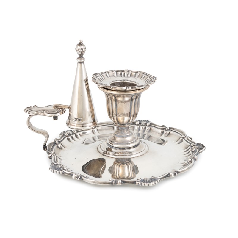 circular form, shell and scroll borders, with a conical snuffer, London 1902, diameter 15.5cm, approx. weight 9.5oz.