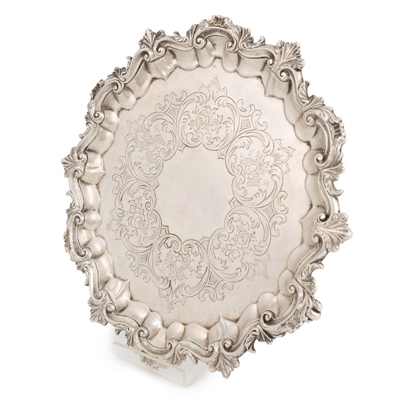circular form, shell and scroll border, the centre with chased decoration, on three foliate bracket feet, diameter 27cm, approx. weight 21oz.