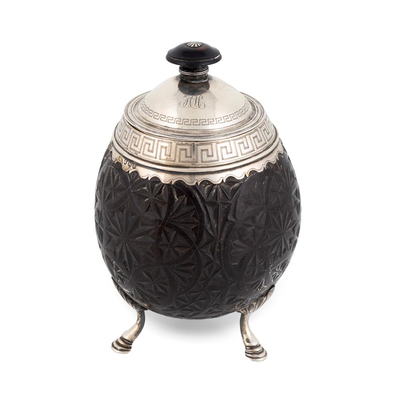 the body with carved decoration, the mounts with Greek key borders, the domed pull-off cover with a wooden finial, on three shell-capped hoof feet, height 17cm.
