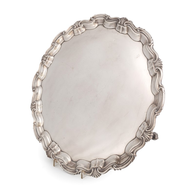 circular form, moulded shell and scroll border, on four gnarl feet, diameter 41.2cm, approx. weight 52oz.