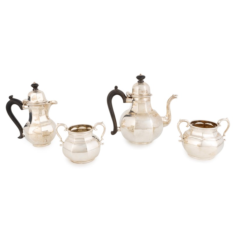comprising: a teapot, a hot water pot, panelled baluster form, scroll handles, domed covers, approx. weight 52.9oz. (4)