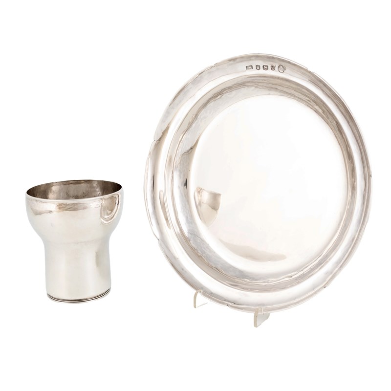 lobed circular form, spot-hammered decoration, diameter 23cm, the beaker of tapering circular form, height 10.5cm, approx. total weight 11oz. (2)