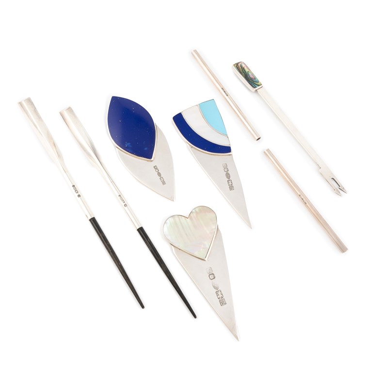 comprising: three modern silver paperknives, London 2009, tapering forms, one with a mother-of-pearl heart handle, one pointed ovoid shape with reconstituted lapis lazuli and one with mother-of-pearl, reconstituted lapis lazuli and reconstituted turquoise inlay, a pair of modern silver-mounted chopsticks, London 1988, shaped triangular handles on lacquered wooden sticks, length 23.2cm, plus a pair of silver straws, London 2013 and a pickle fork, London 1979, total approx. weighable 1.9oz. (8)