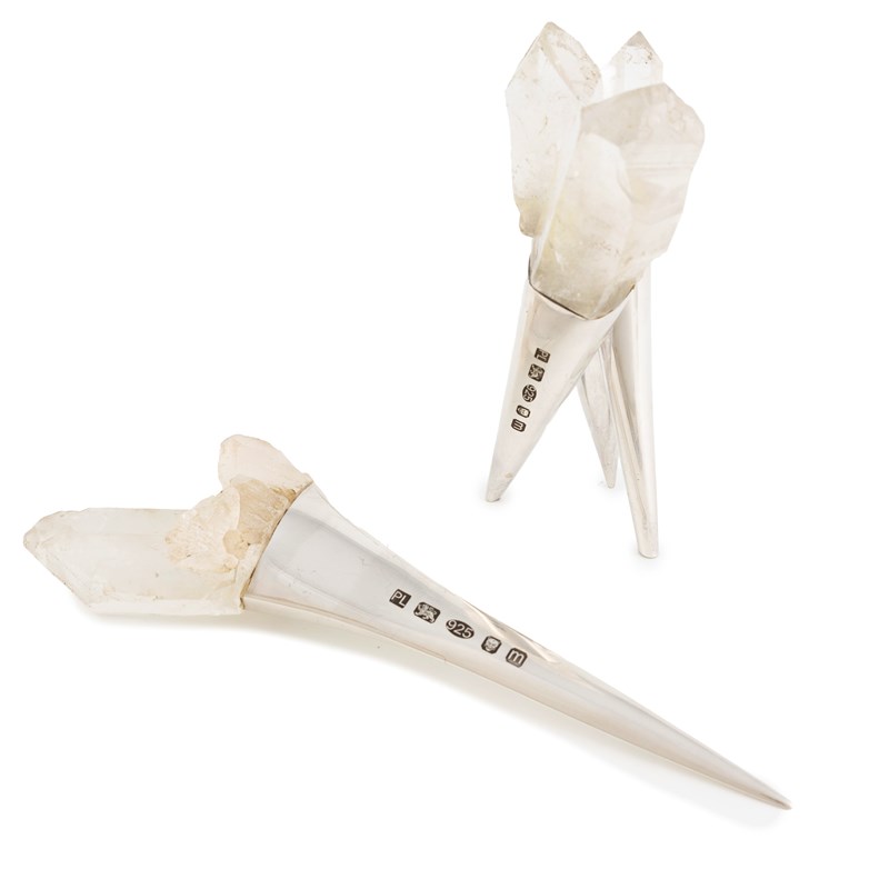 tapering forms with mounted rock crystals, height 19.4cm. (2)