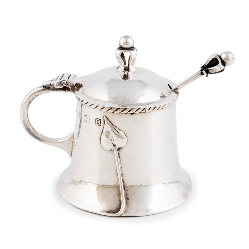 By G.L. Connnell, an Arts and Crafts silver mustard pot and spoon,
