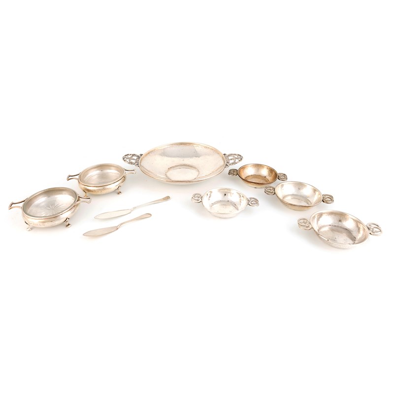 By A.E.Jones, a collection of Arts & Crafts silver two-handled dishes,