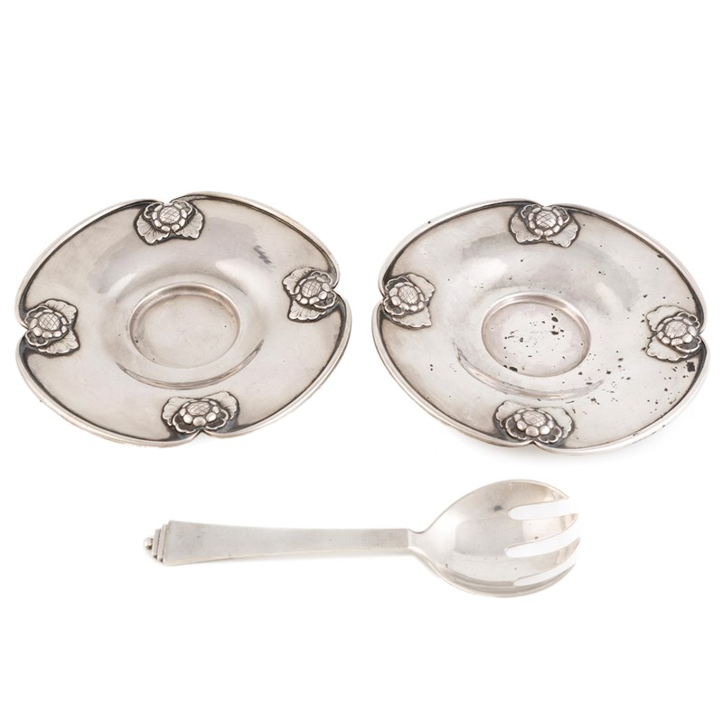 shaped circular forms with floral motifs to the raised border, diameter 15.5cm, plus a Danish silver pyramid pattern salad fork, total approx. weight 12.3oz. (3)