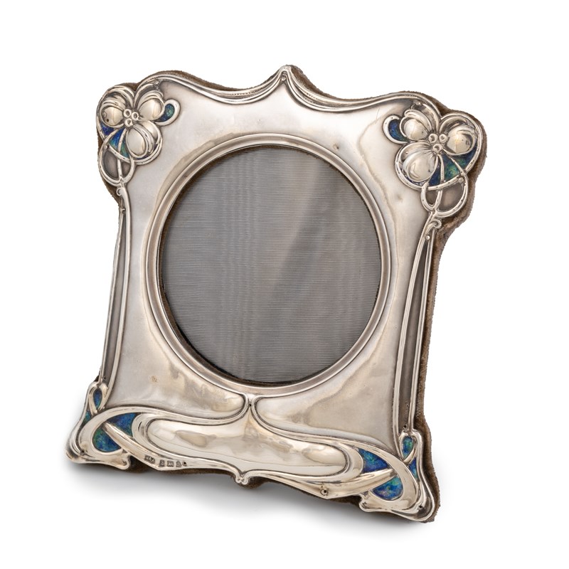An Edwardian Art Nouveau silver and enamel photograph frame,