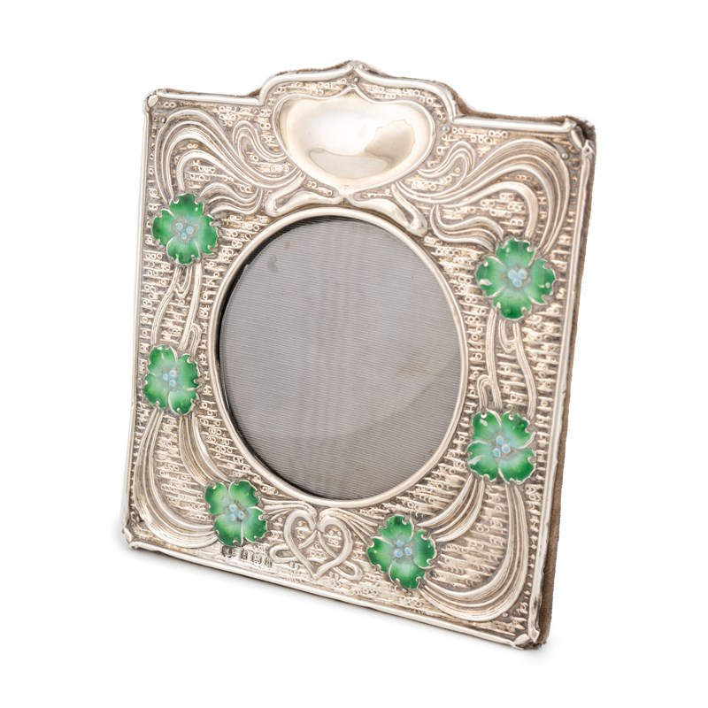 An Edwardian Art Nouveau silver and enamel photograph frame,