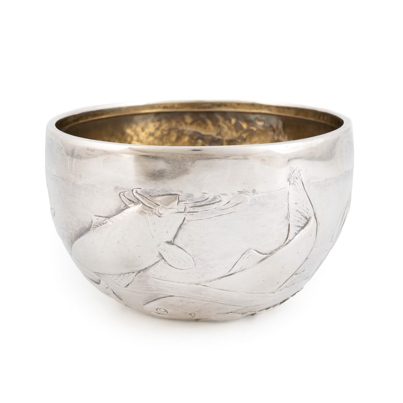 circular form with a chased trout swimming in between the reeds, diameter 10.2cm, approx. weight 6.7oz.