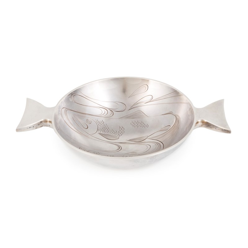 circular form with fish tail handles, engraved salmon decoration to the interior bowl, length handle to handle 20.7cm, approx. weight 19.3oz.