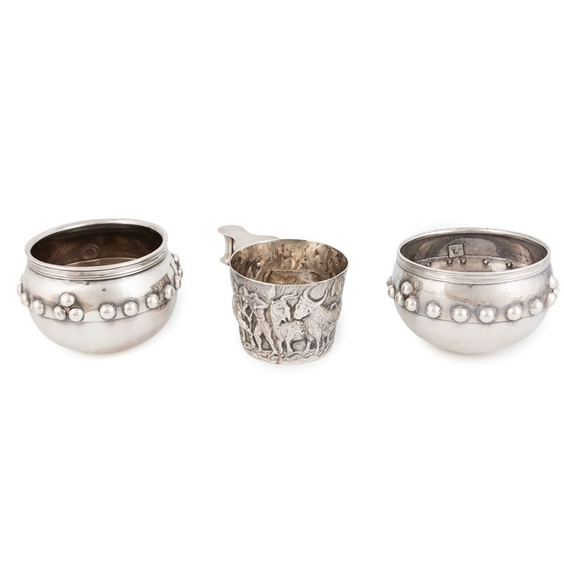 circular form with a spot-hammered finish, applied beads to the body, engraved presentation inscription, diameter 11.2 cm, plus an electroplated 'Glastonbury' bowl, and a silver copy of the Vaphio cup by Nathan & Hayes, Birmingham 1900, total approx. weighable 17.2oz. (3)