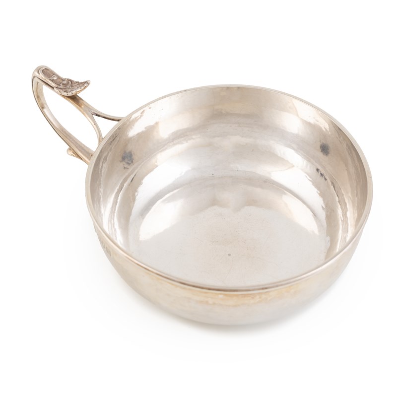 circular tapering form with leaf-capped scroll handle, length 15.2cm, approx. weight 4.5oz.