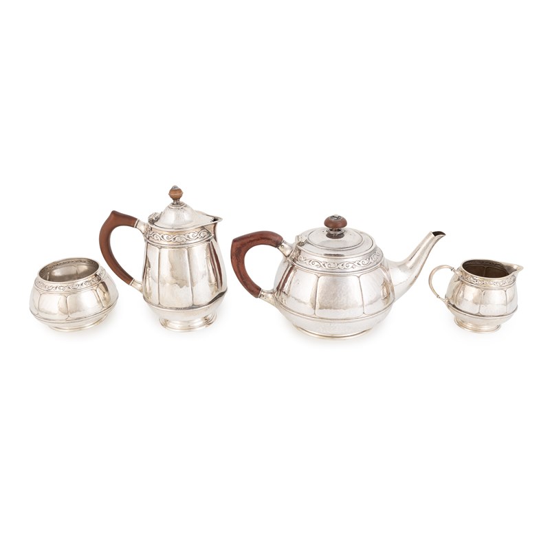 lobed tapering form with stylised scroll decorative band, spot-hammered decoration, scroll handles, on circular feet, length handle to spout 24cm, total approx. weight 38oz. (4)