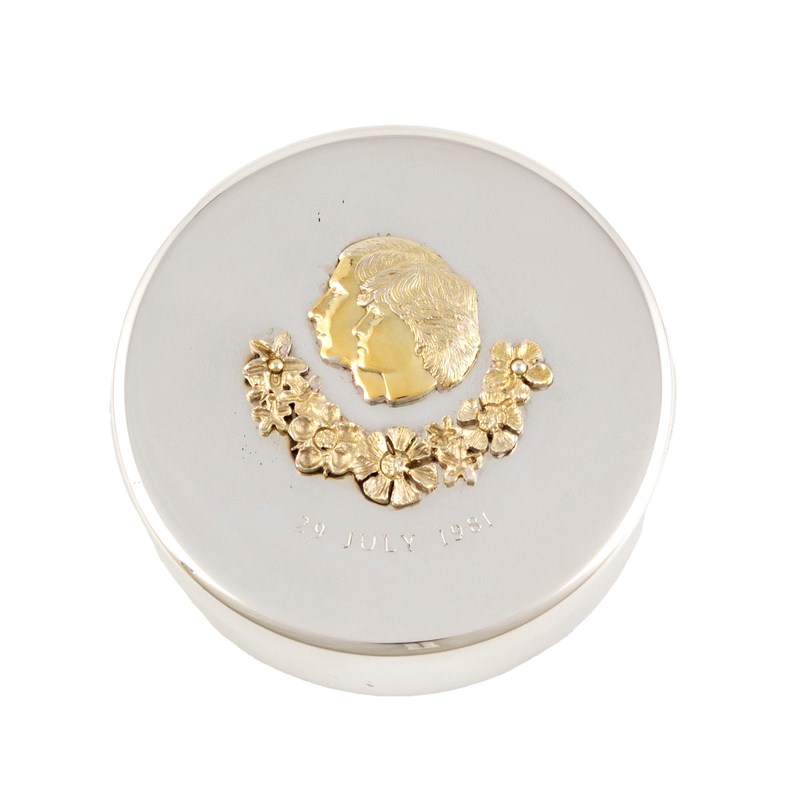 circular form, the pull-off cover applied with a silver-gilt bas-relief of Charles and Diana, above a garland of flowers, inscribed '29 July 1981', diameter 6.8cm, approx. weight 4.3oz.