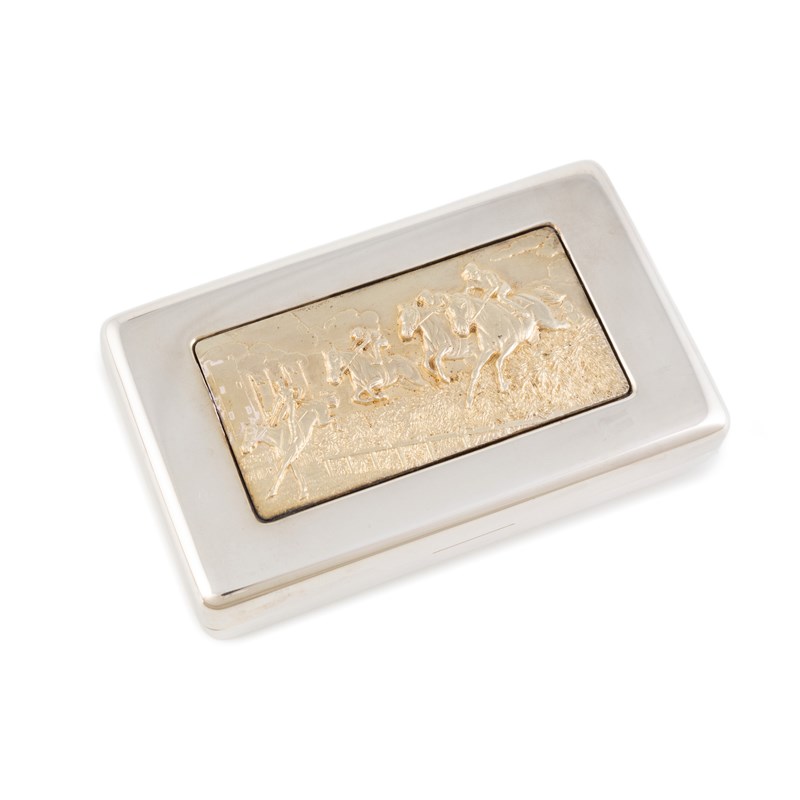 rounded rectangular form, the hinged cover with relief panel of a steeple chase, length 9.7cm, approx. weight 4.8oz.