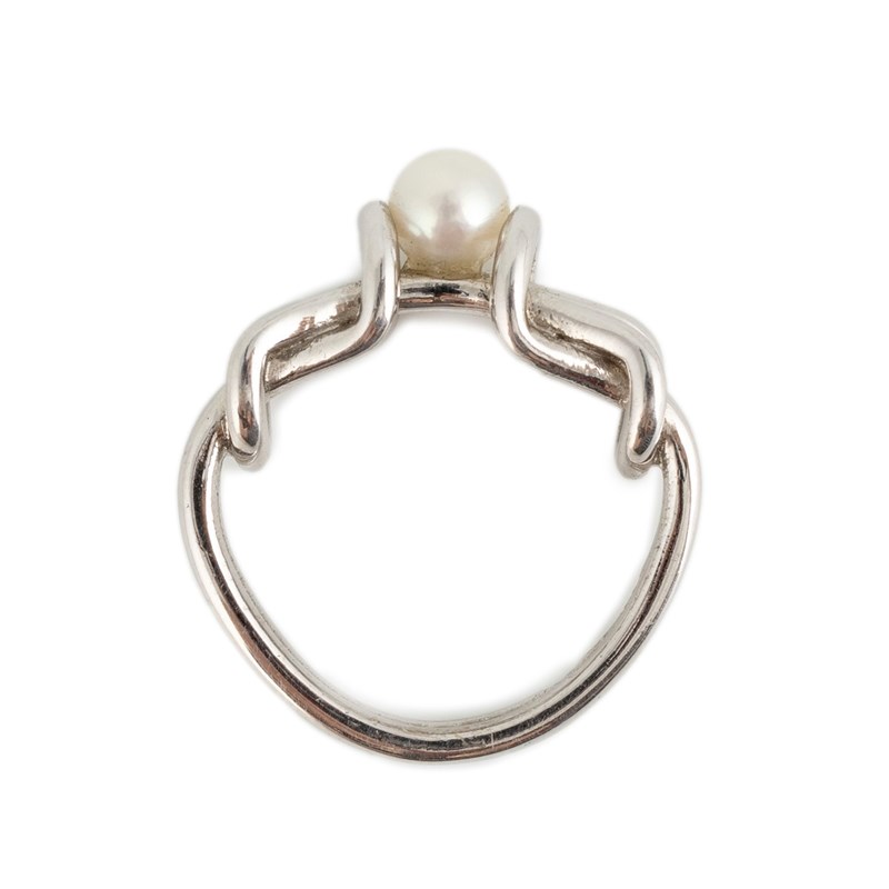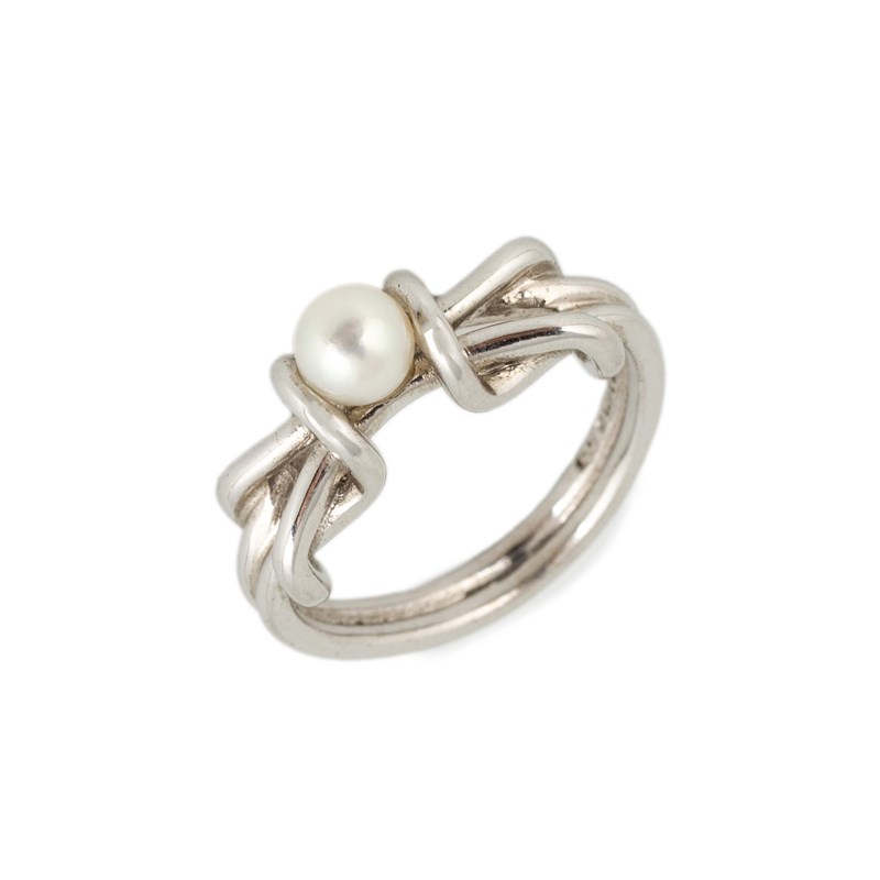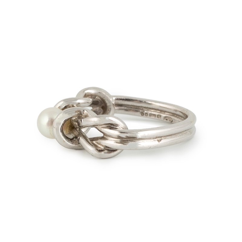 By Stuart Devlin, a modern 18-carat white gold and pearl reef knot ring,