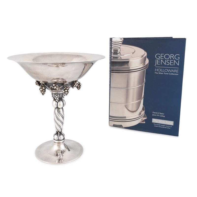 grape pattern, the circular pedestal foot with spiral twist decoration, the circular bowl with hanging bunches of grapes, spot-hammered decoration, height 27.1cm, plus D. A. and Laskey, J. W., Georg Jensen Holloware, approx. weighable 37.8oz. (2)