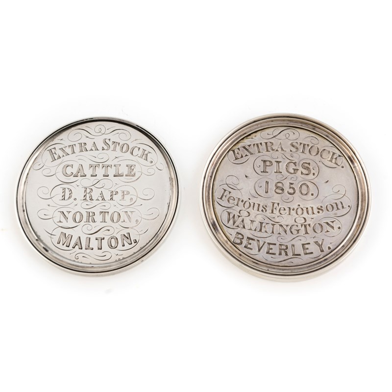 circular form, inscribed 'Yorkshire Agricultural Society, Second Prize', the reverse inscribed 'Extra Stock Pigs 1850, Fergus Ferguson, Walkington, Beverley', diameter 6cm, plus another silver agricultural medal, possibly York 1858, later maker's mark RH, inscribed 'Yorkshire Agricultural Society, Second Prize, 1860', the reverse inscribed 'Extra Stock Cattle, D. Rapp. Norton. Malton', loose in frame, approx. total weight 2oz. (2)