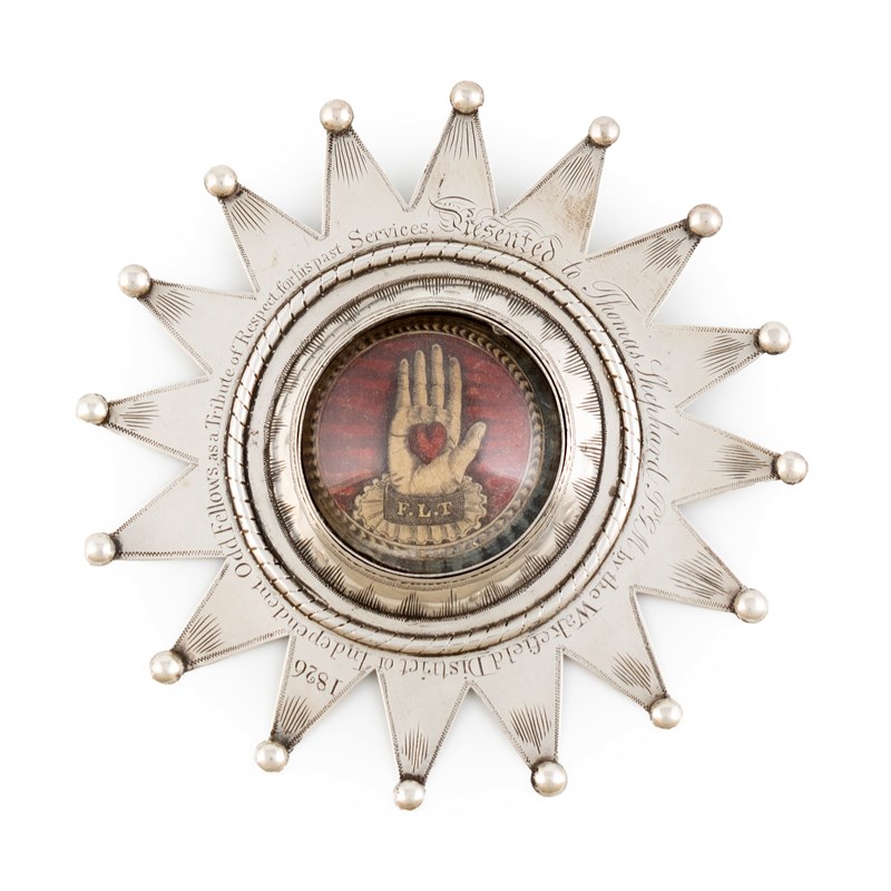 the sixteen-pointed star with ball finials, engraved decoration, the centre with a hand and heart on paper under glass, inscribed 'Presented to Thomas Shephard GPGM by the Wakefield District of Independent Odd Fellows as a Tribute of Respect for his past Services', length 12.8cm.