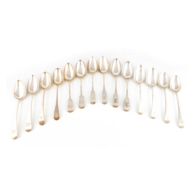 A collection of seven pairs of late-18th/early-19th century provincial silver tablespoons,