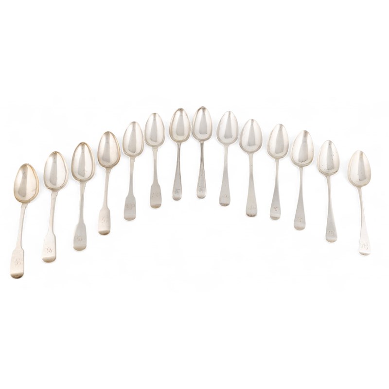 A collection of seven pairs of early-19th century provincial silver tablespoons,