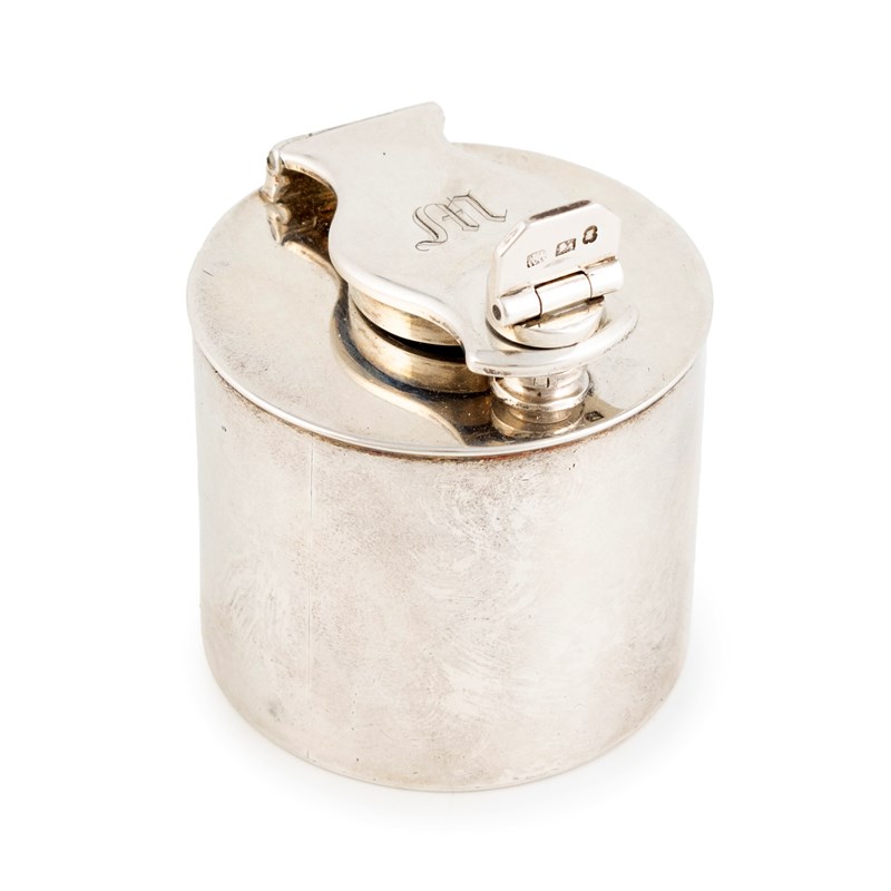 plain cylindrical form, screw-down hinged cover, initialled, height 5cm, approx. weight 3oz.