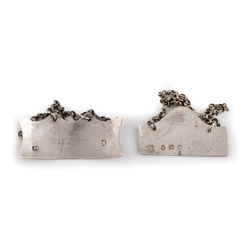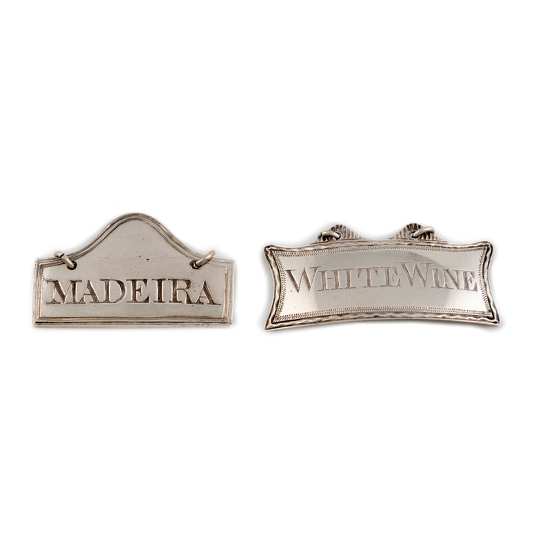 shaped rectangular form, bright-cut border, incised 'White Wine', length 5cm, plus a George III provincial silver wine label, by Prince and Cattles, York circa 1805, rectangular form with a raised pediment, incised 'Madeira', approx. weight 0.5oz. (2)