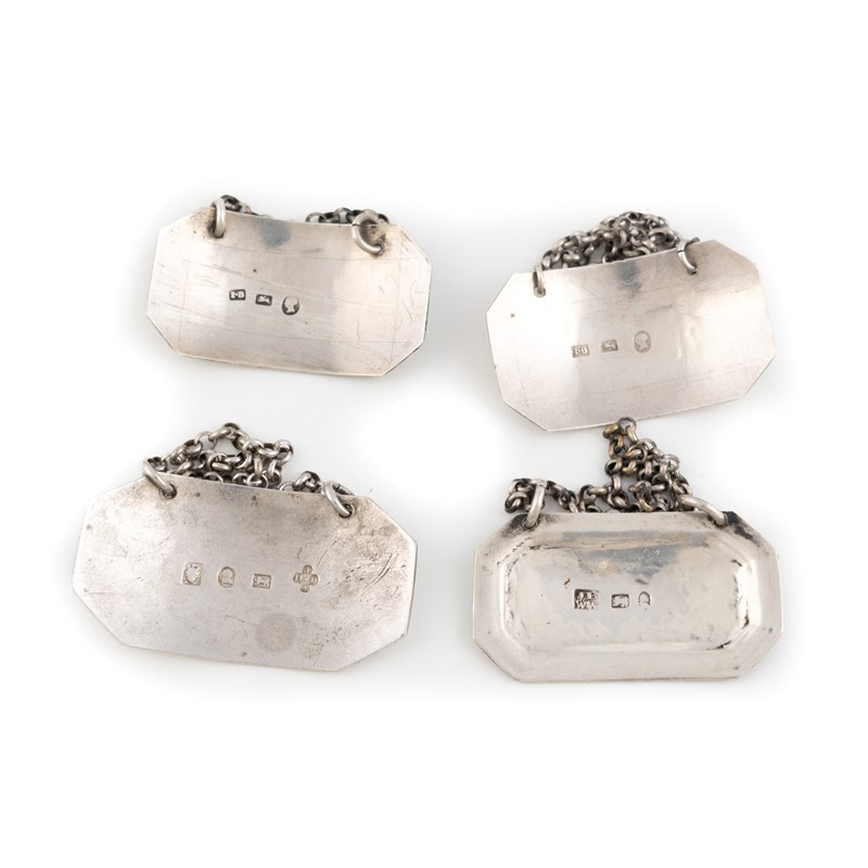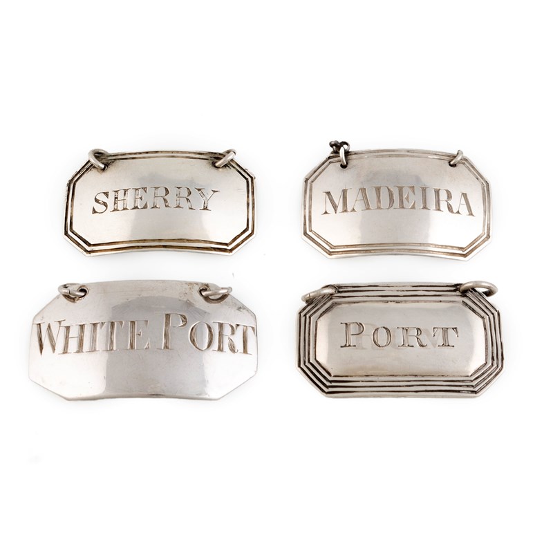 York, rectangular form, canted corners, including: one by Hampson and Prince, York circa 1795, incised 'White Port', one by Barber and Whitwell, incised 'Port', and two by John Bell, incised 'Sherry' and 'Madeira', approx. total weight 1.2oz. (4)