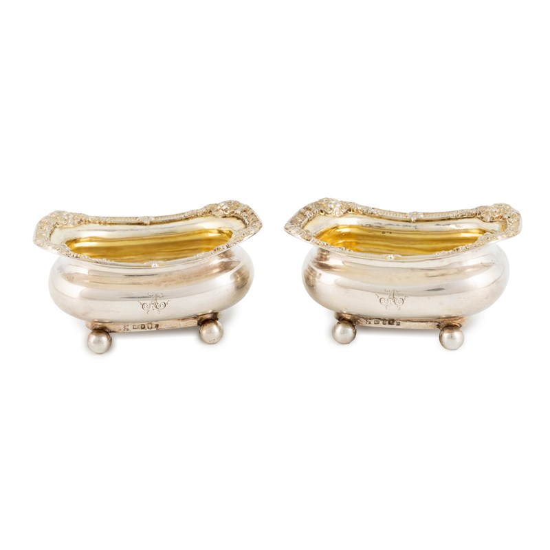 rounded rectangular bellied form, the borders with foliate and lion mask decoration, on four ball feet, length 9.3cm, approx. weight 5.7oz. (2)