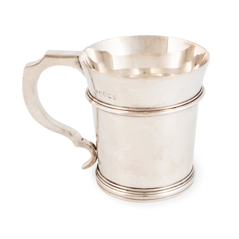 tapering circular form, scroll handle, reeded girdle, engraved with a crest, height 9.1cm, approx. weight 9.9oz.