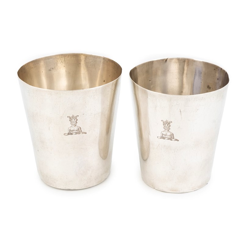 tapering circular form, engraved with a crest, heights 8.2cm and 8.3cm, approx. weight 5.5oz. (2)