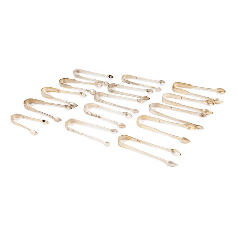 A collection of fifteen pairs of antique provincial silver sugar tongs,
