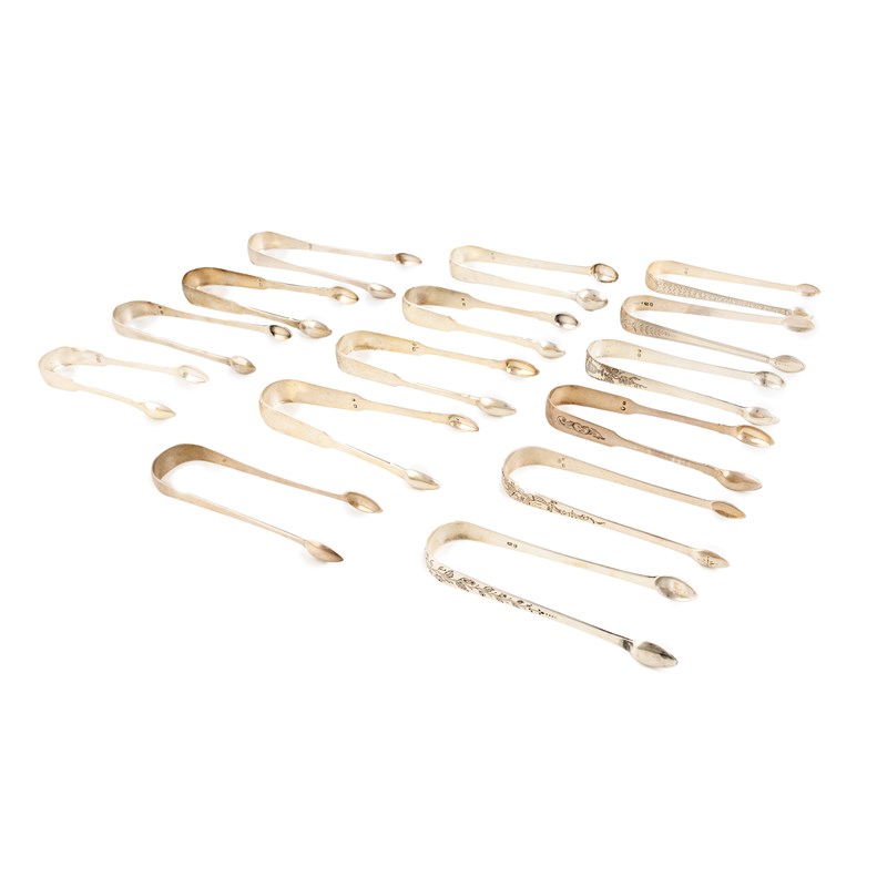A collection of fifteen pairs of antique provincial silver sugar tongs,