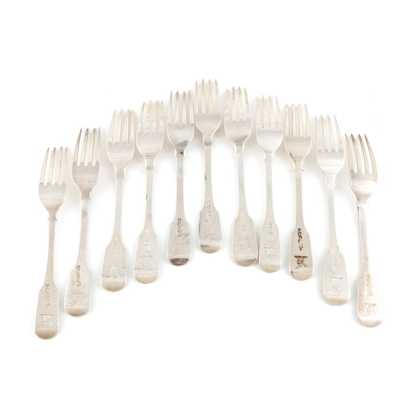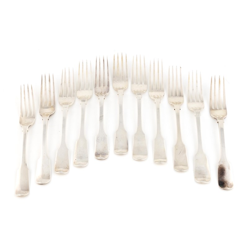 A matched set of eleven early-19th-century provincial silver Fiddle pattern dessert forks,