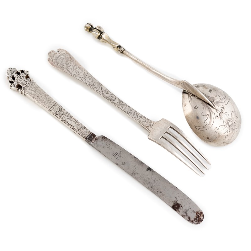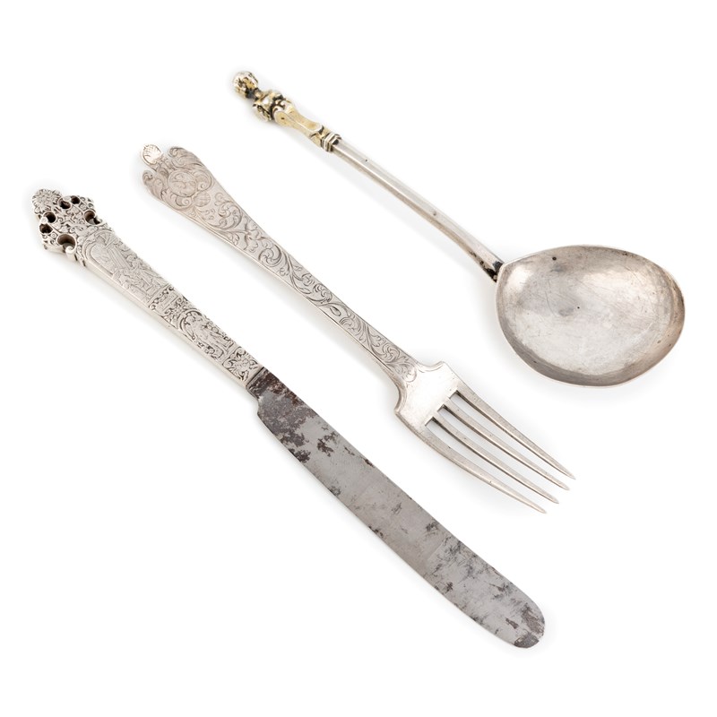 fig-shaped bowl, faceted stem, gilded figural finial, the knife unmarked, tapering and finely chased with figural and religious decoration, inscribed, rebladed, plus an unmarked fork, with engraved foliate scroll decoration, and engraved with a head, length of knife 20cm, approx. weight 2.6oz. (3)