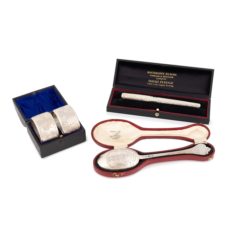 chased with the motto and symbol of the Company, in a fitted case, the cover with the Company Arms, the interior with 'Anthony Elson Goldsmith and Silversmith London and David Pledge CAD CAM engine-turning', length 13.5cm, plus a pair of Victorian cased silver Aesthetic Movement napkin rings, by George Unite, Birmingham 1882, and a cased silver spoon, Sheffield 1930, approx. weighable 3.2oz. (3)