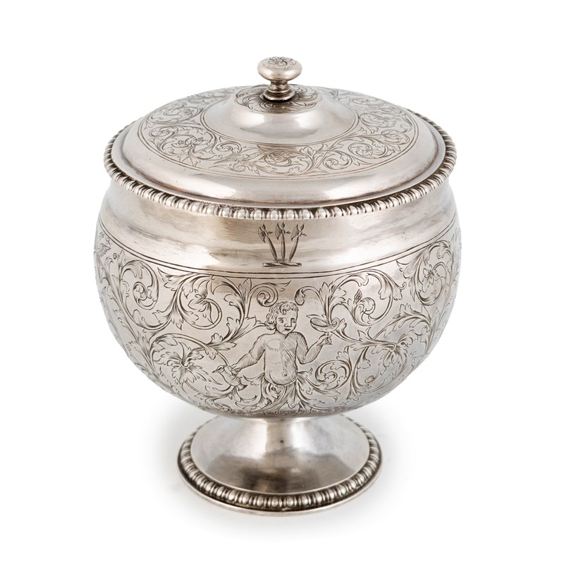 circular form, engraved with figures amongst foliate scroll decoration, gadroon borders, the pull-off cover with similar decoration and with a knop finial, height 12cm, approx. weight 5.9oz.