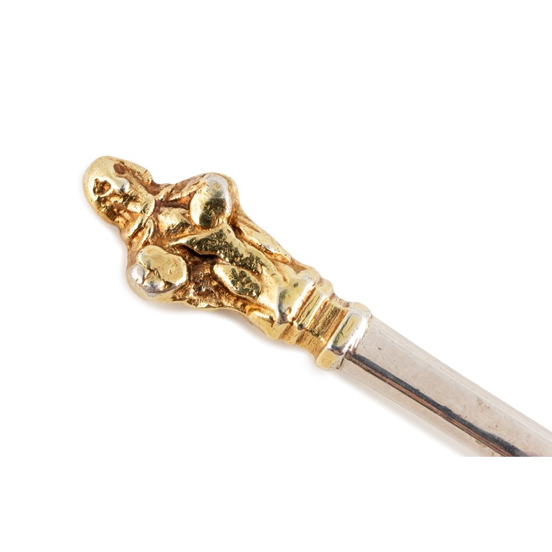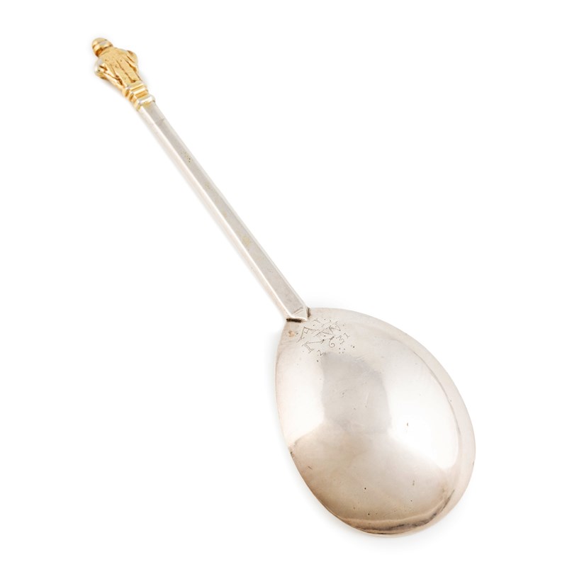 fig-shaped bowl, the reverse prick-dot initialled 'A.L' over 'N.W' over '1631', faceted stem, gilded finial, no nimbus, length 18.5cm, approx. weight 1.8oz.
