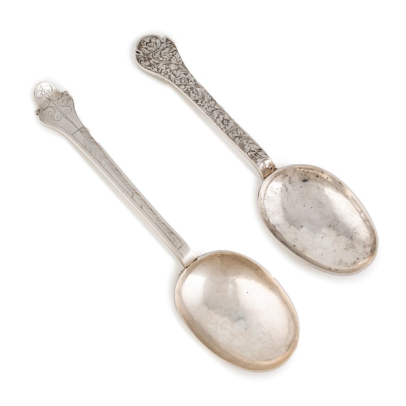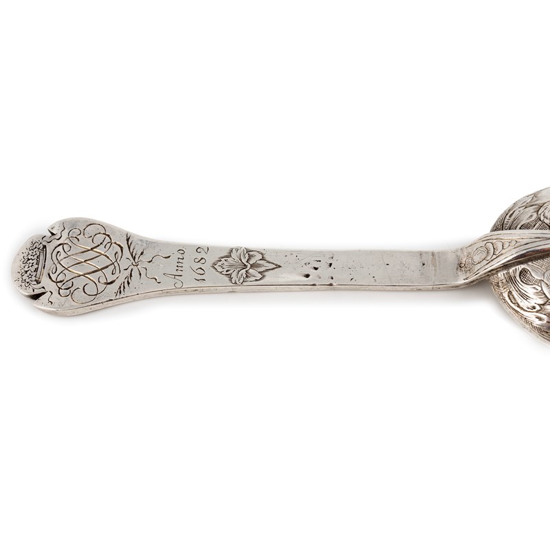 oval bowl, the stem with engraved simple decoration, the reverse of the terminal with scratch initials 'ED' over a flower, length 19.5cm, plus a late-17th century silver Trefid spoon, marks lost in repair, circa 1682, engraved decoration, the reverse with a crowned cypher and 'Anno 1682', length 17.9cm, approx. weight 4oz. (2)