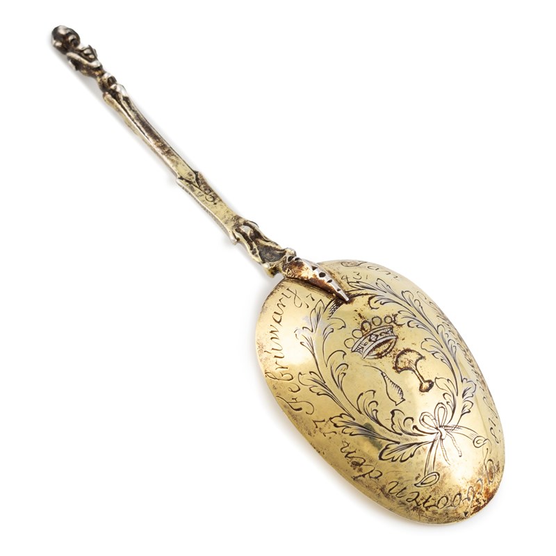 oval bowl, the reverse of the bowl with two crowned emblems within a foliate band, also inscribed and dated '1743', figural terminal, length 17.1cm, approx. weight 1.5oz.