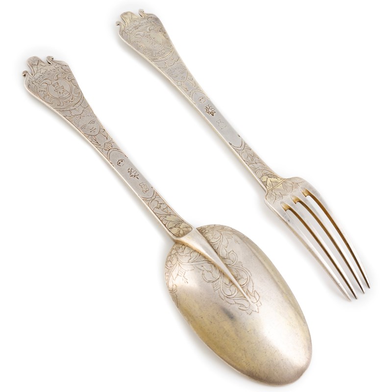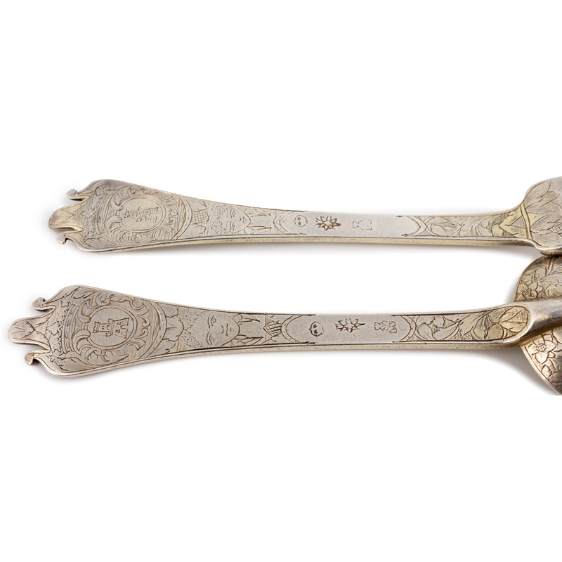 the reverse of the oval bowl with a plain rat-tail and engraved decoration, the reverse of the stem with a mask and scroll decoration, engraved with a crest, length 17.9cm and 16.5cm, approx. weight 3oz. (2)