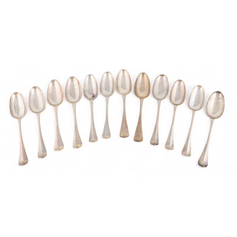 A collection of six pairs of 18th century silver Hanoverian pattern tablespoons,