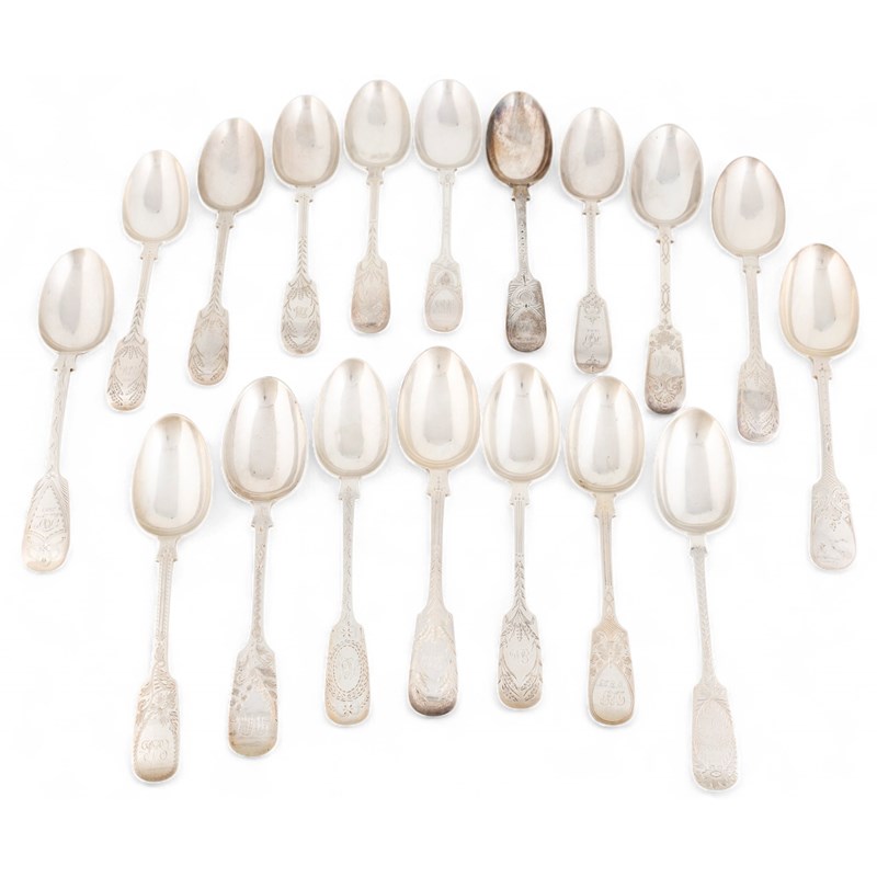 A collection of eighteen Channel Island silver decorated Fiddle pattern tablespoons,
