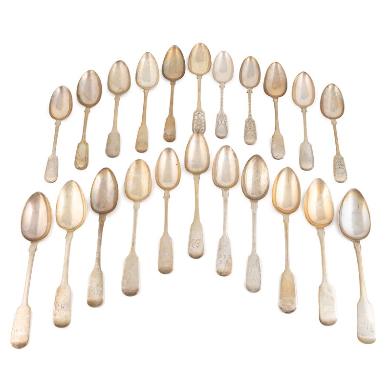 A collection of twenty West Country silver Fiddle pattern tablespoons,