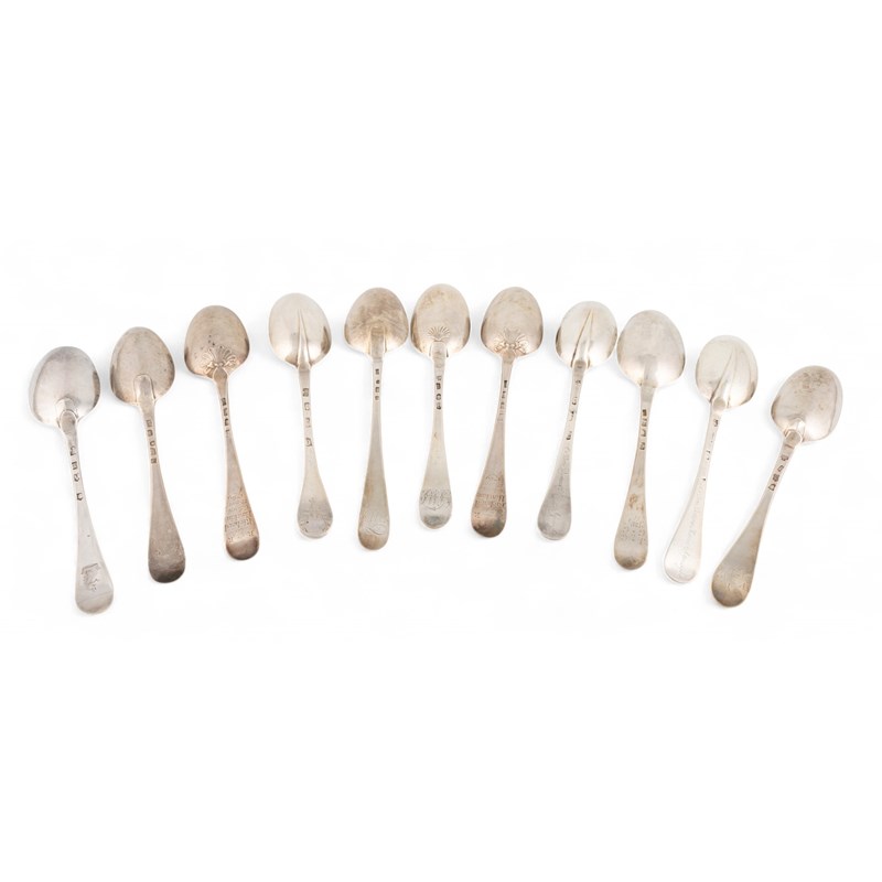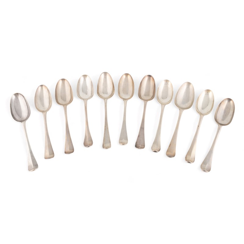 A collection of eleven 18th century silver Hanoverian pattern tablespoons,