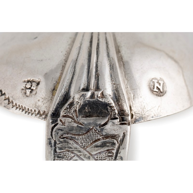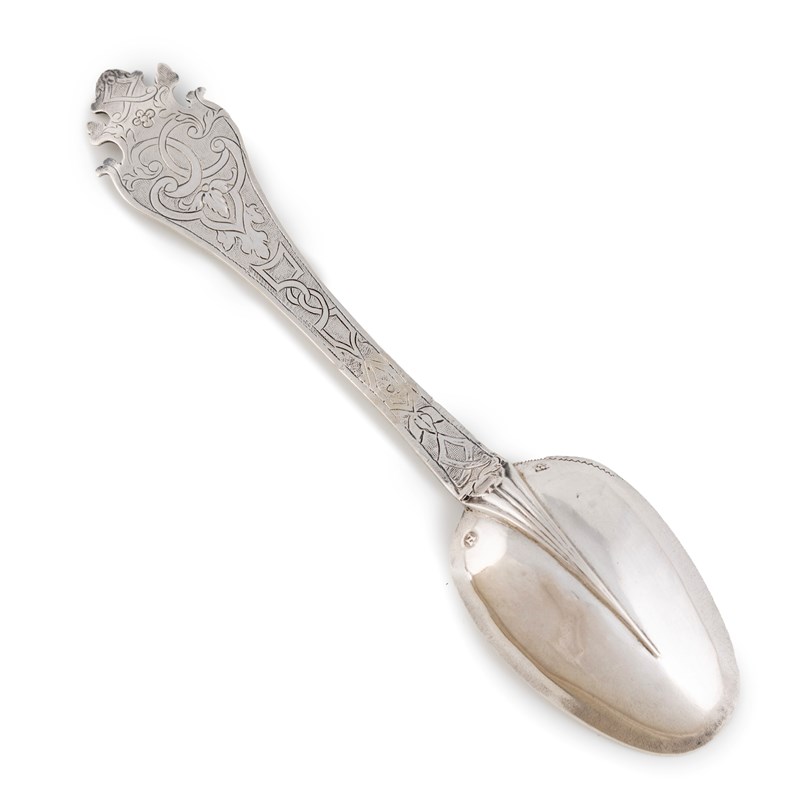 oval bowl with a plain rat-tail, the front and back of the stem with foliate and scroll decoration on a matted background, elaborate Trefid finial, length 20.1cm, approx. weight 1.2oz.