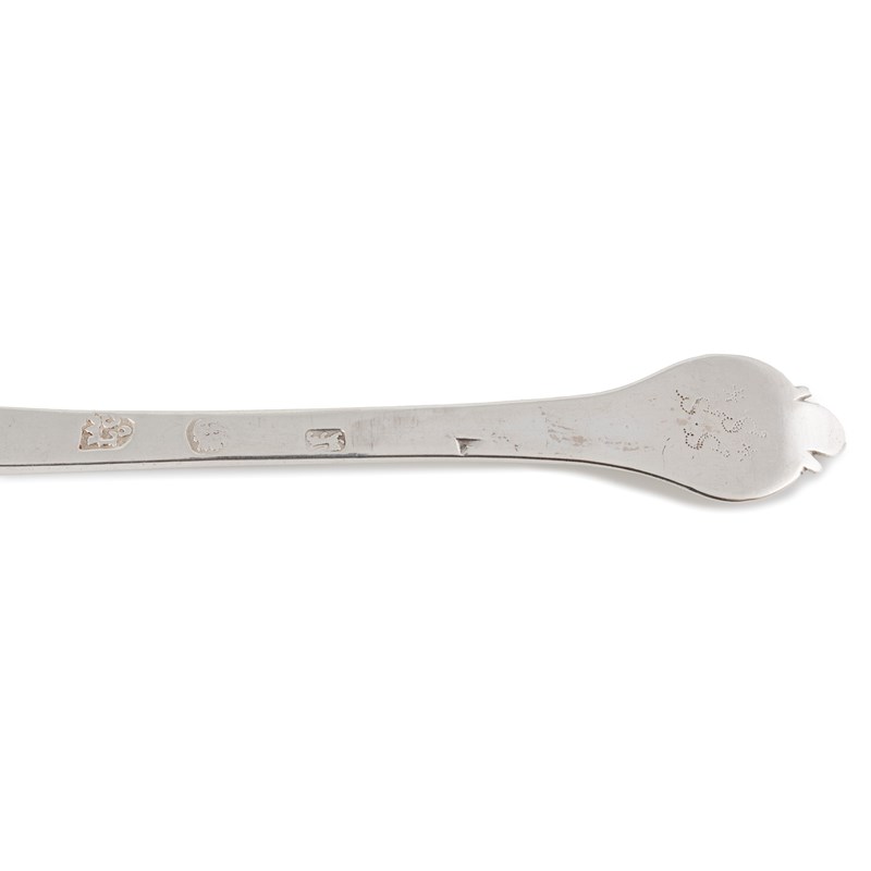 the reverse of the bowl with a rat-tail and scroll decoration, the terminal with foliate scroll decoration, the reverse of the terminal scratch initialled 'S' over 'S.S', length 19.8cm, total approx. weight 3oz. (2)